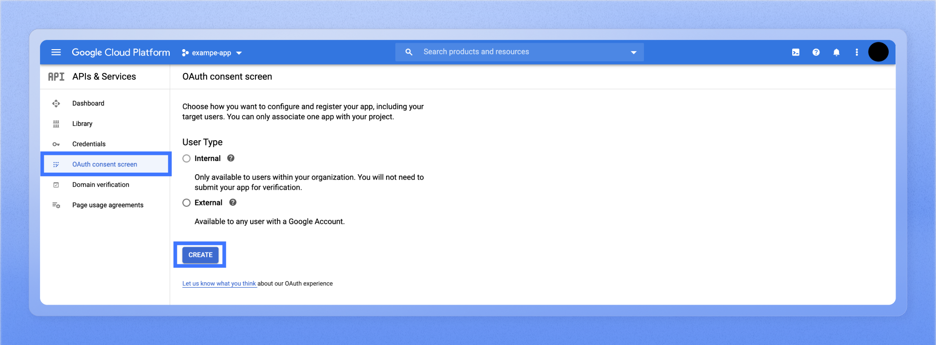 - Navigate to the OAuth consent screen under APIs & Services. Choose your configuration and target users, then click Create.
