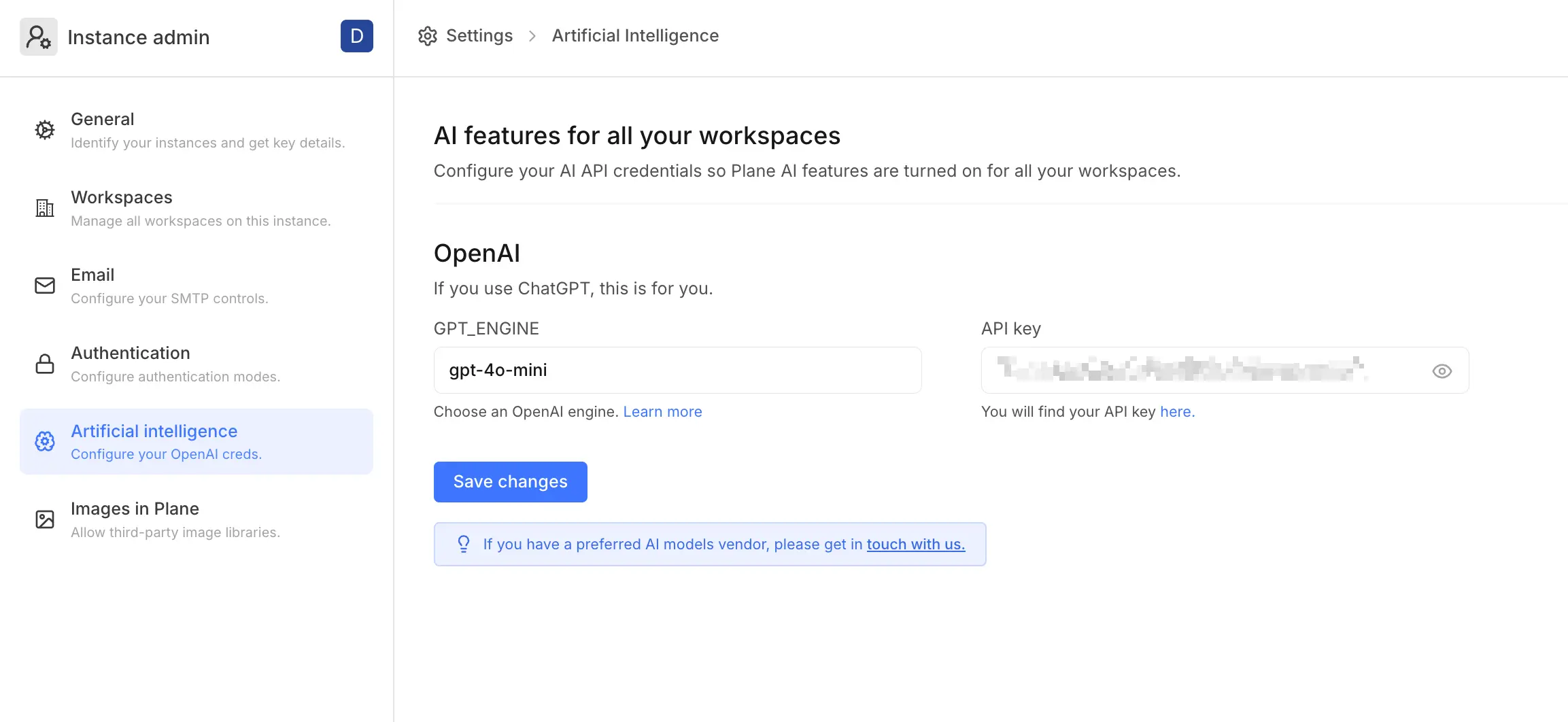 Plane supports the use of AI throughout your projects. For now, we support OpenAI’s APIs and keys. You can configure them here or leave them blank if you don’t wish to offer AI features to your users. Your Plane experience remains largely unchanged if you don’t set this up.