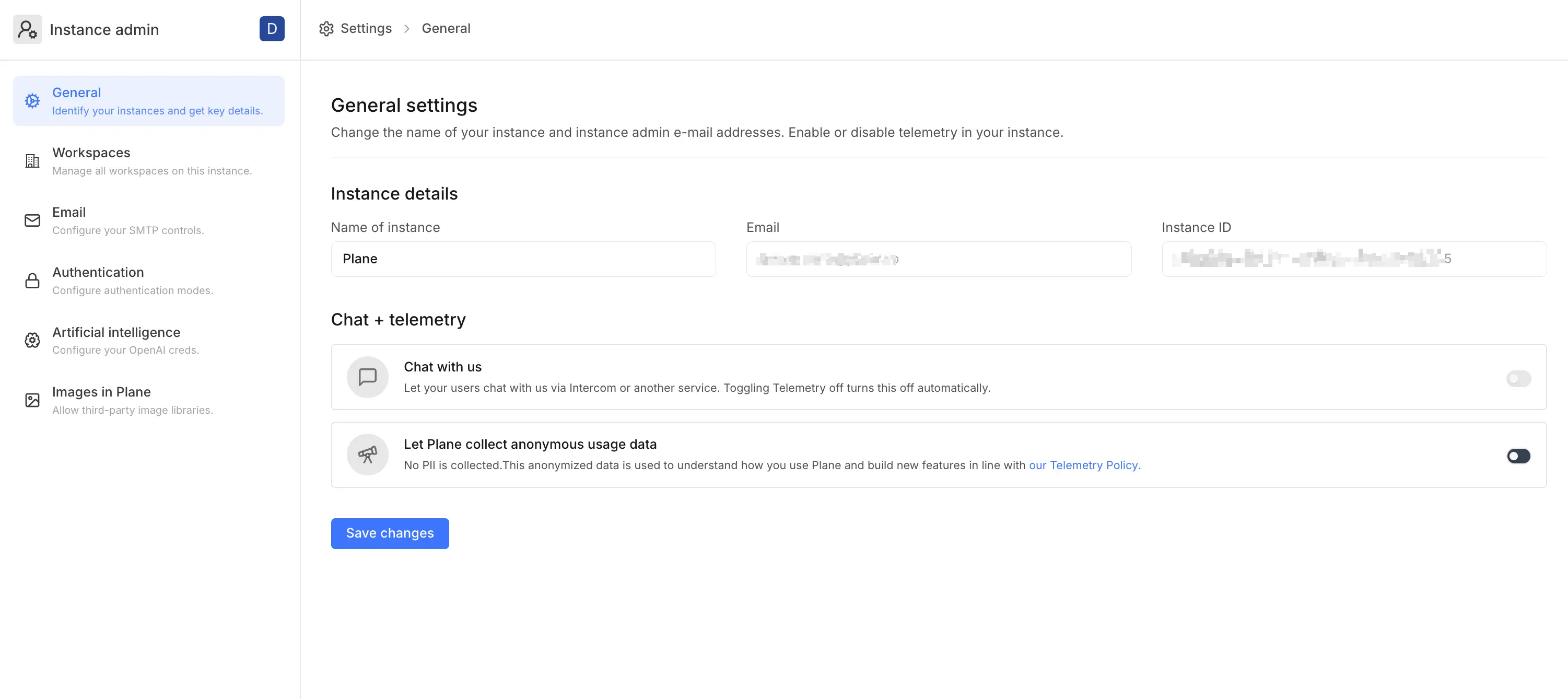 The General settings page allows you to view or configure core instance details and telemetry preferences. Here’s what you can manage: